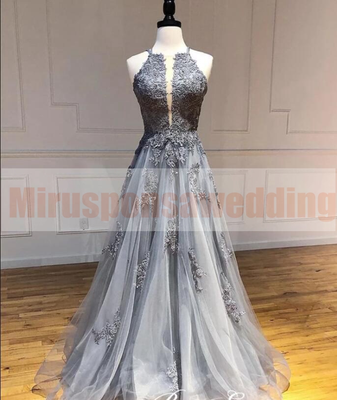Gray round neck lace tulle long prom gray evening gowns