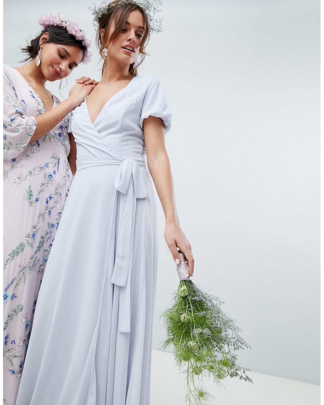 TFNC Wrap Maxi Bridesmaid Dress With tfnc wrap maxi bridesmaid dress with tie detail and puff sleeves