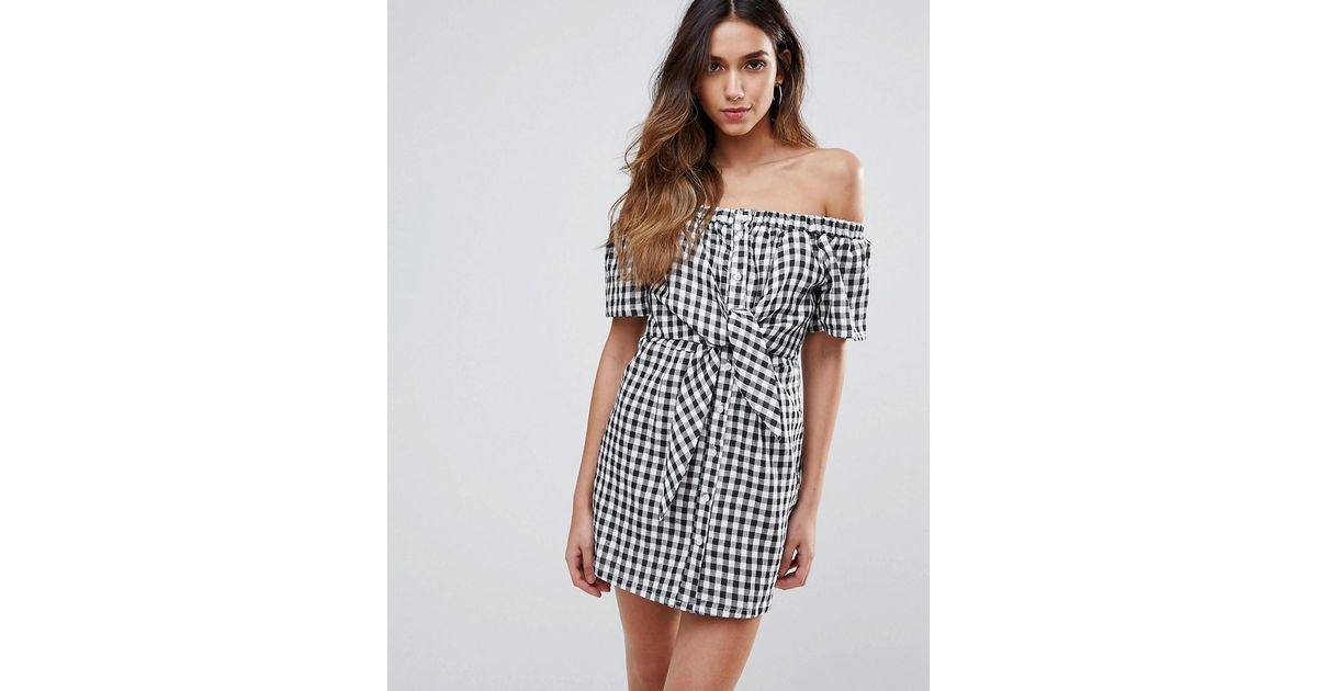 Missguided Cotton Gingham Bardot Tie bardot tie front dress