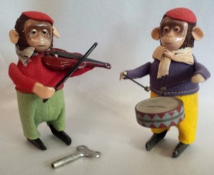 Vintage Pair SCHUCO tin toy monkeys wind up drummer toy