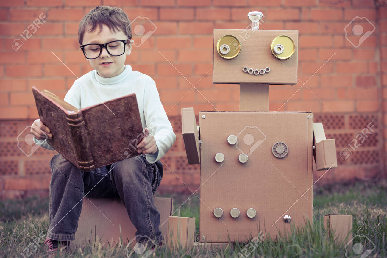 Cardboard Boxes Outdoors Stock Photo robot and boy science