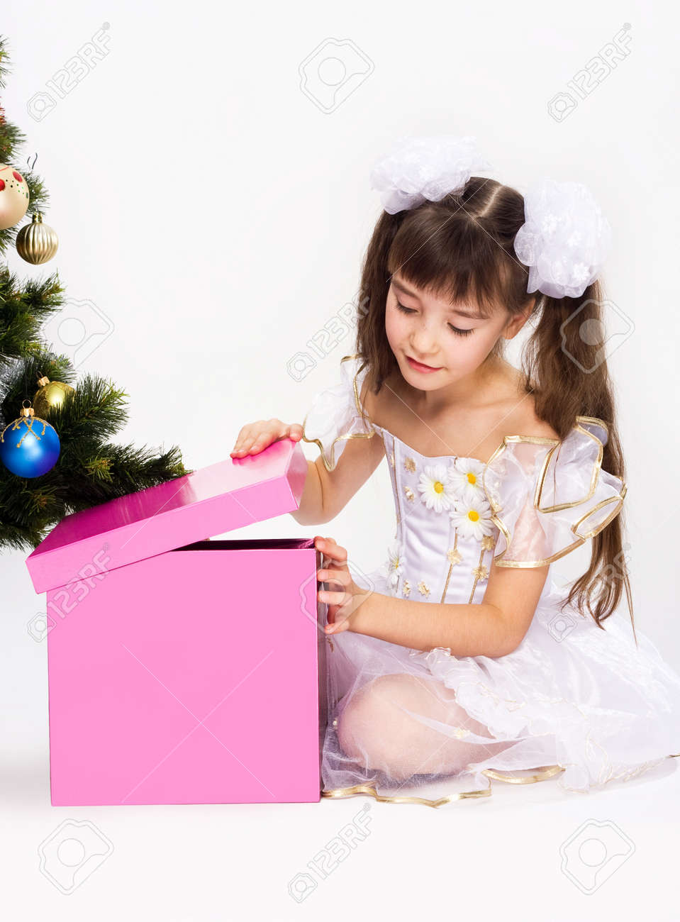 Year Winter Christmas Tree girl opening christmas presents