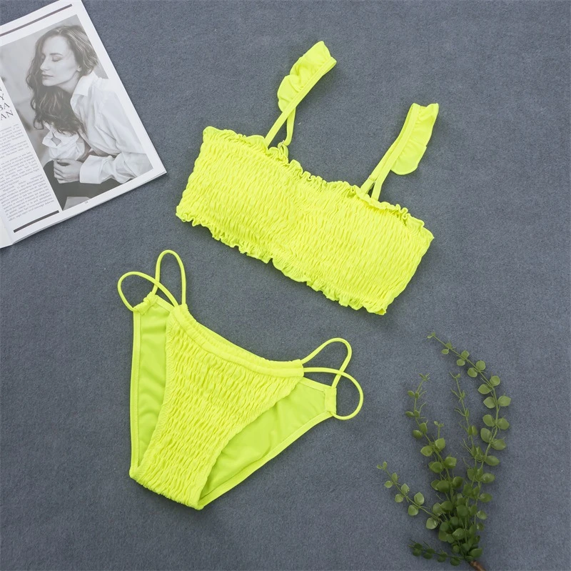 Sexy Neon Swimwear Beach Suit Frilled yellow smocked bandeau bikini