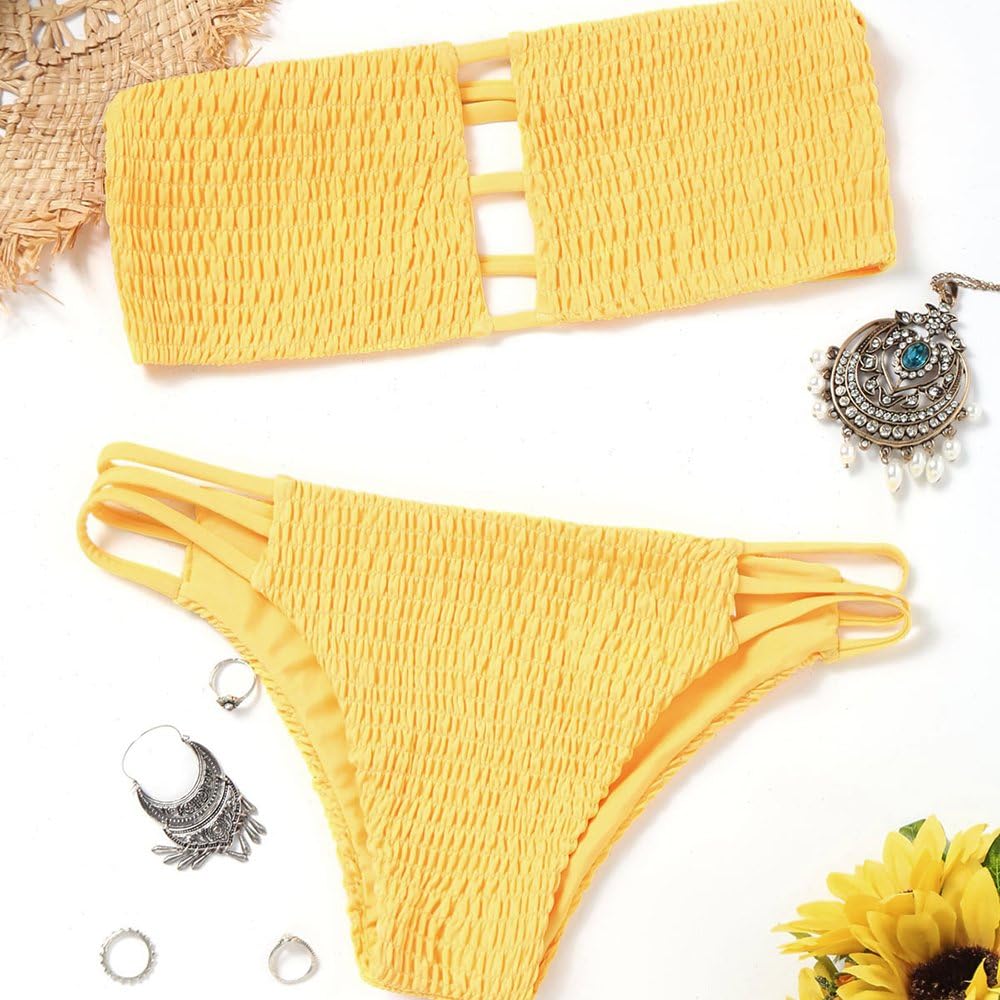 ZAFUL Women's Strapless Shirred Smocked yellow smocked bandeau bikini
