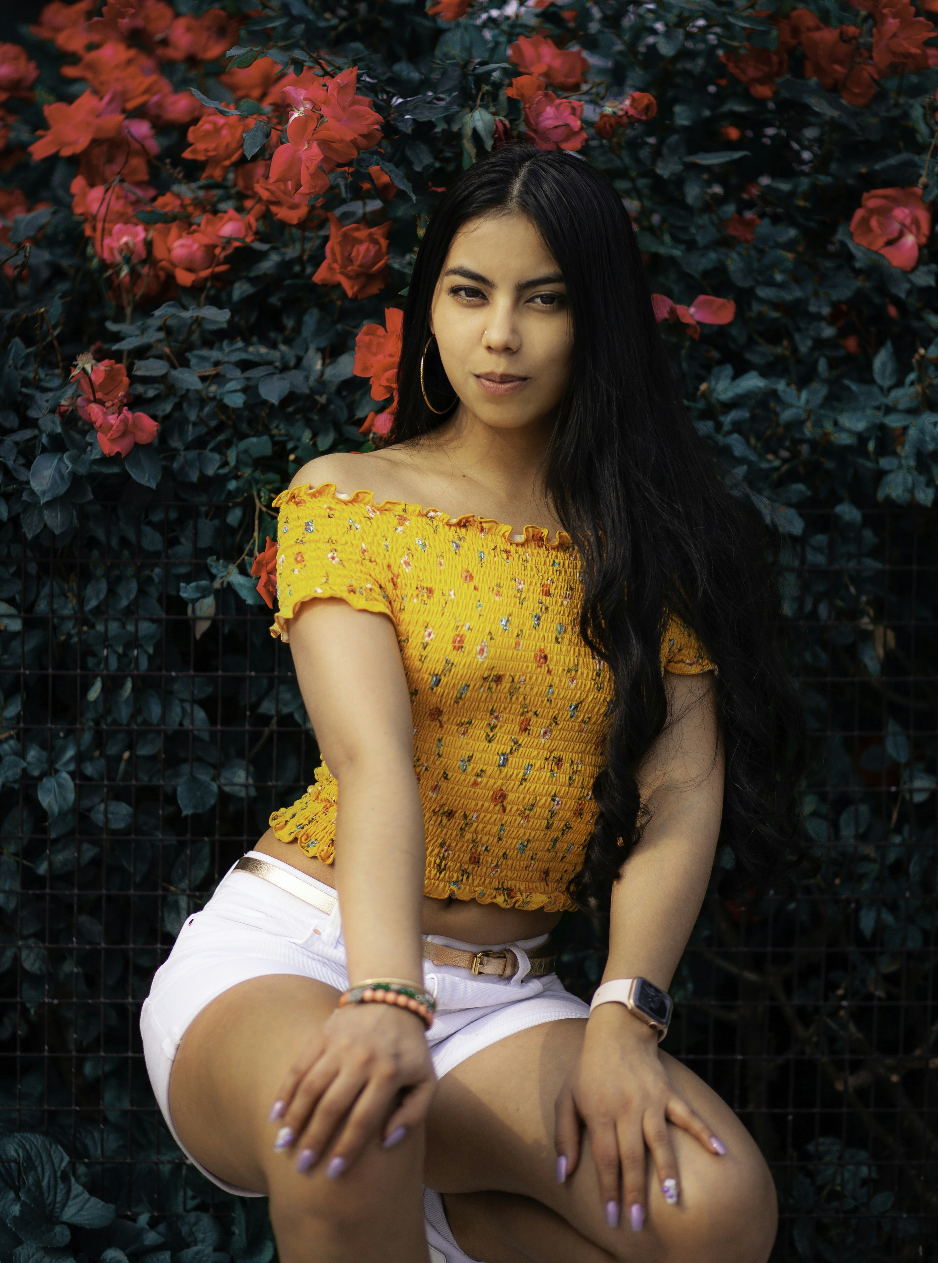 woman in yellow, red, and green floral yellow off shoulder blouse