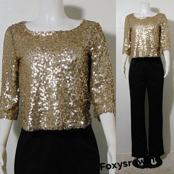 Vintage sequin gold top Bedazzled shirt bronze sequin top