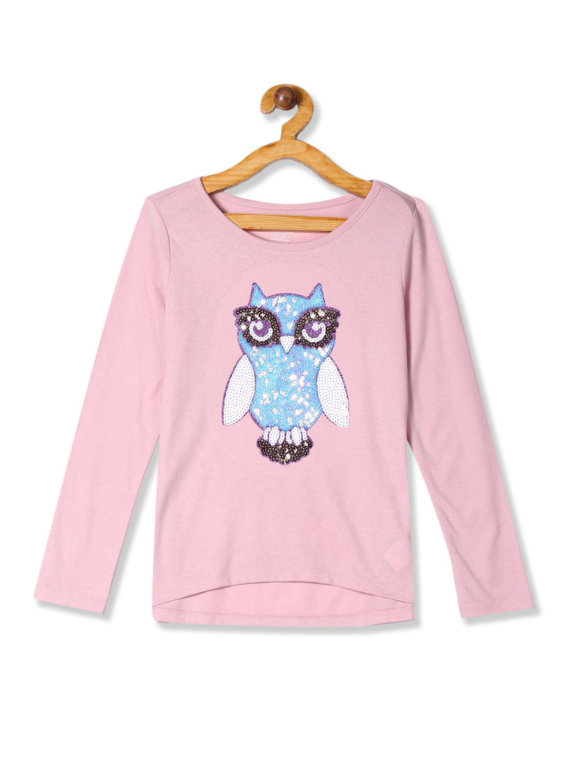 Pink Long Sleeve Embellished Graphic pink high low top